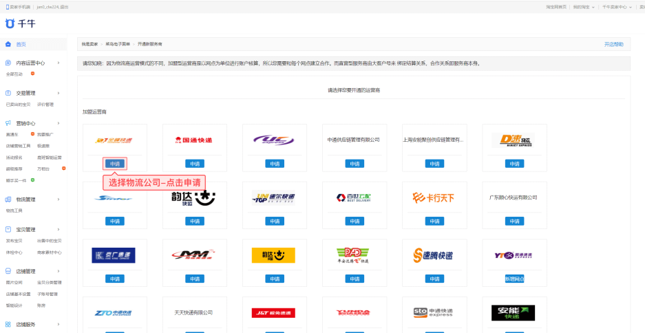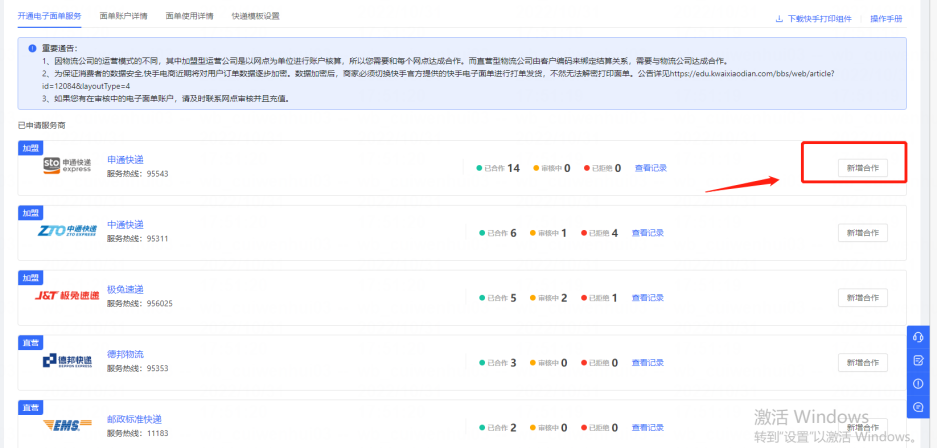 選擇需要合作的的物流公司,點(diǎn)擊【新增合作】