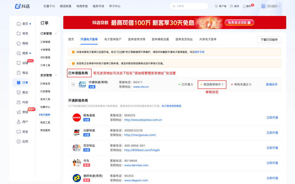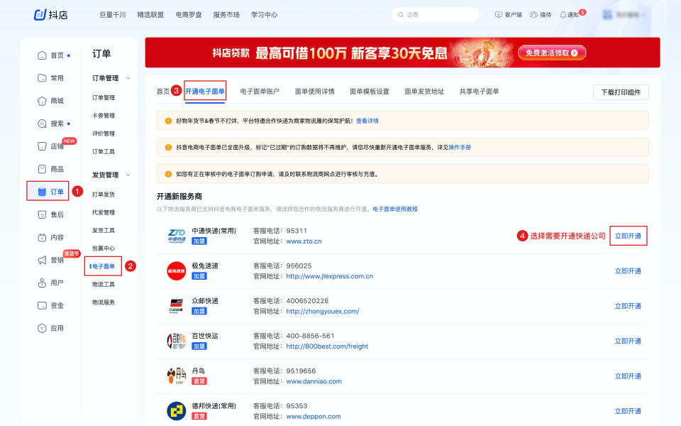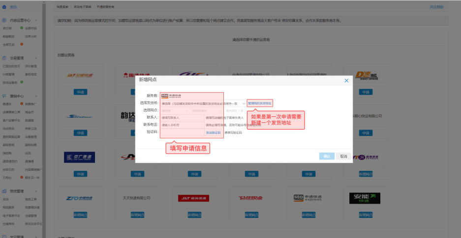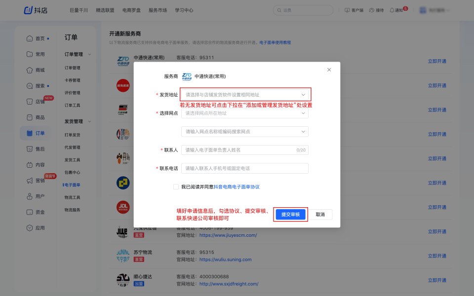 點(diǎn)擊訂單 ?? 電子面單 ?? 開通電子面單服務(wù) ?? 選擇快遞公司 ?? 新增網(wǎng)點(diǎn) ?? 填寫相關(guān)信息