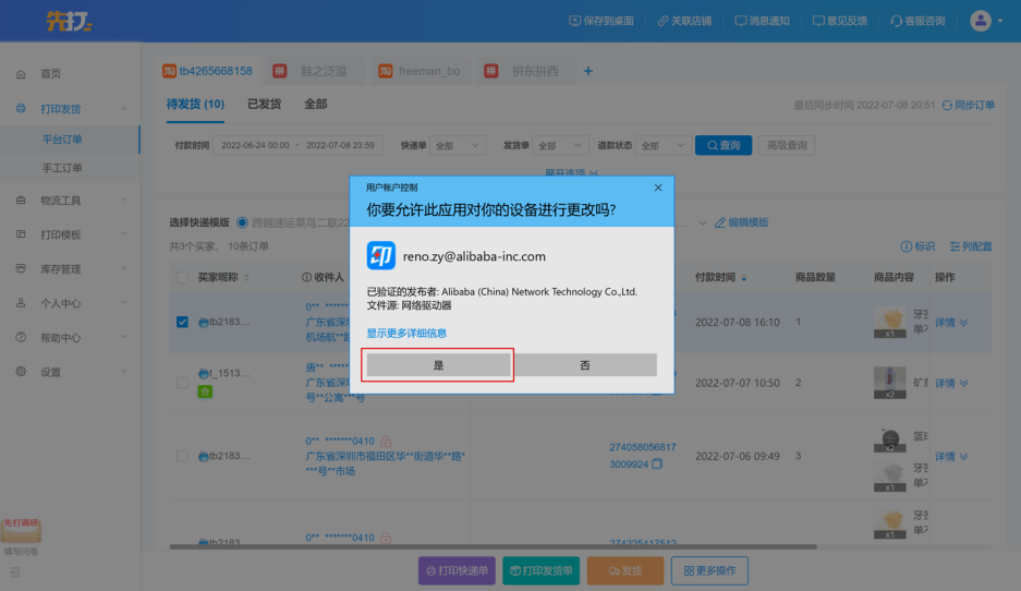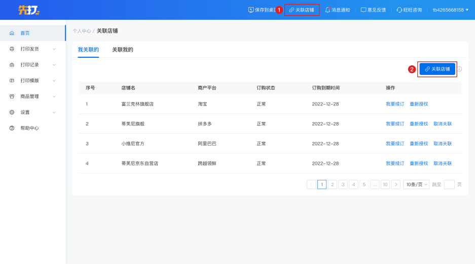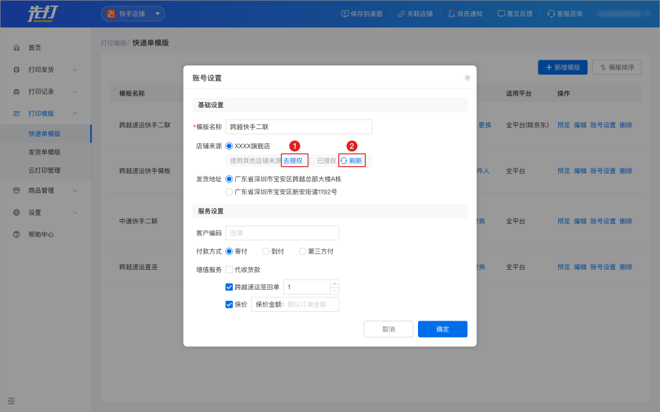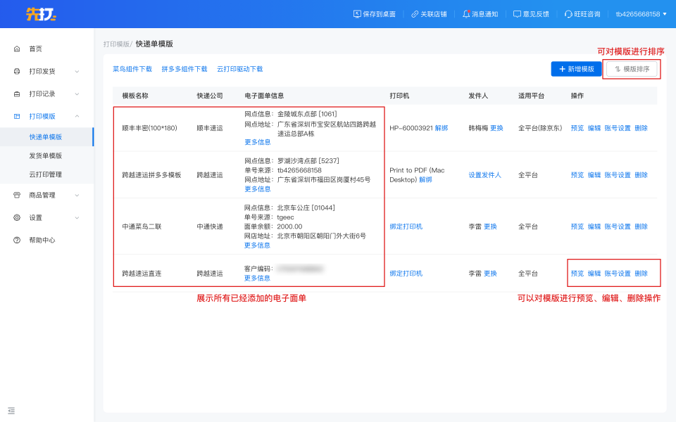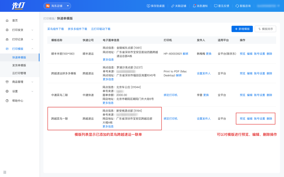 3?? 關(guān)聯(lián)店鋪后,登錄店鋪A的賬號(hào),也可選擇店鋪A的快遞模板打印發(fā)貨店鋪B的訂單,實(shí)現(xiàn)電子面單共享。