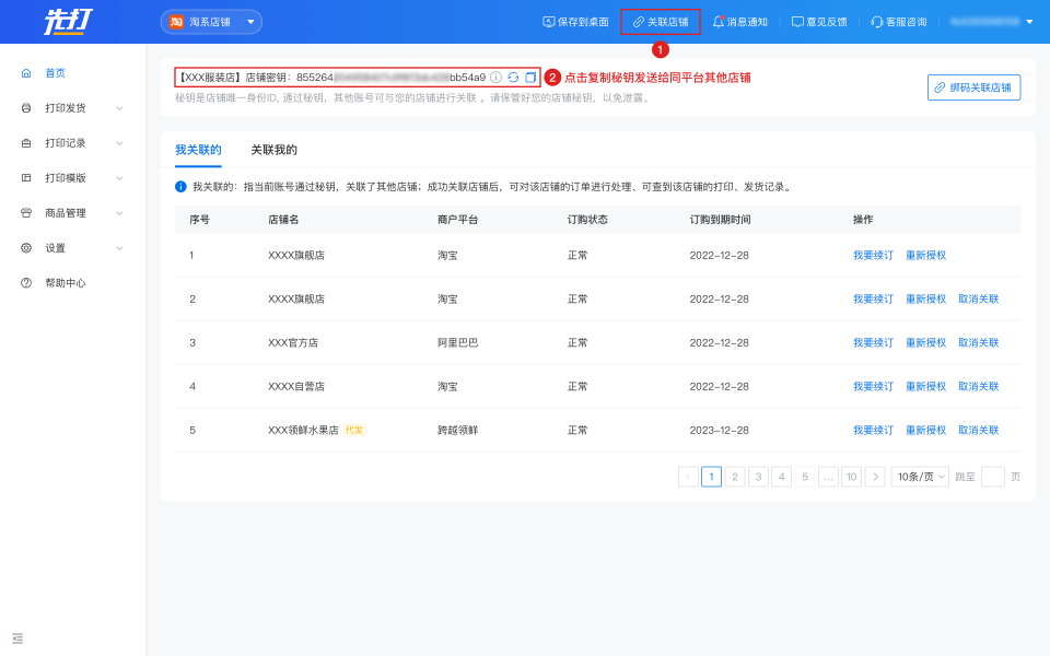 1?? Step1:登錄A店鋪,點(diǎn)擊【關(guān)聯(lián)店鋪】?? 復(fù)制店鋪密鑰,將秘鑰粘貼分享給需要關(guān)聯(lián)的B店鋪即可