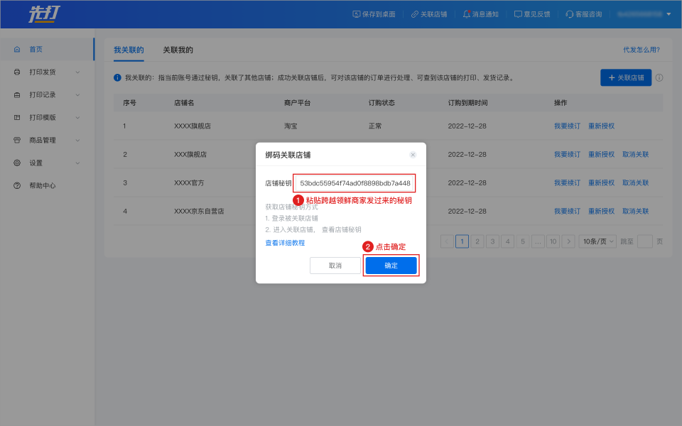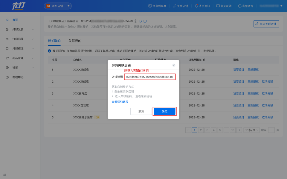 2?? Step2: B店鋪在【關(guān)聯(lián)店鋪】?? 點(diǎn)擊【綁碼關(guān)聯(lián)店鋪】粘貼A店鋪提供的秘鑰,點(diǎn)擊【確定】后即成功關(guān)聯(lián)A店鋪