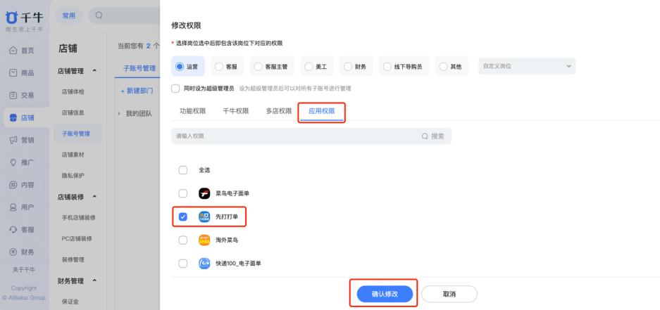 2?? Step 2:進(jìn)入修改權(quán)限,選擇應(yīng)用權(quán)限模塊,勾選需要授權(quán)的應(yīng)用 ?? 確認(rèn)修改,即完成子賬號(hào)的授權(quán)