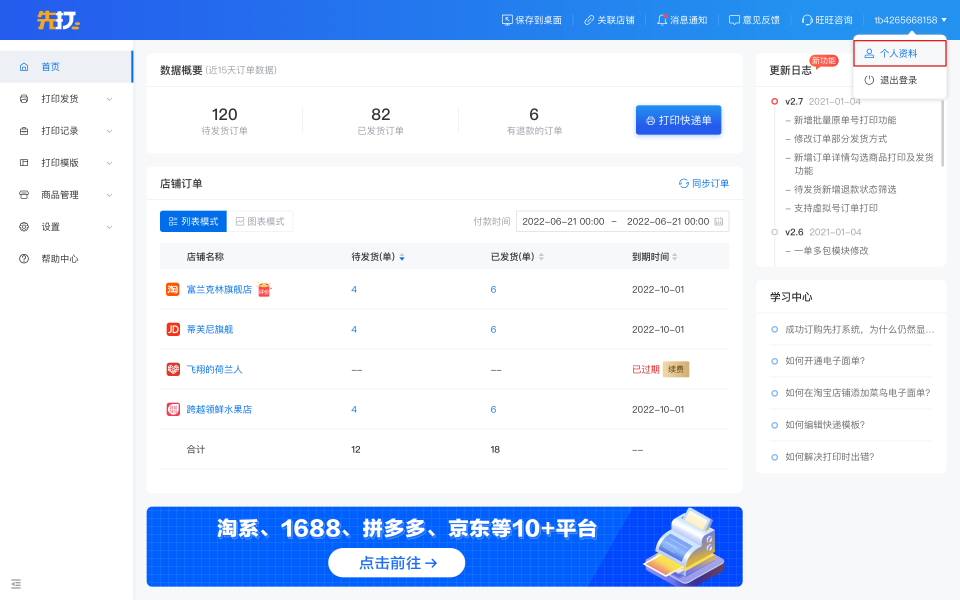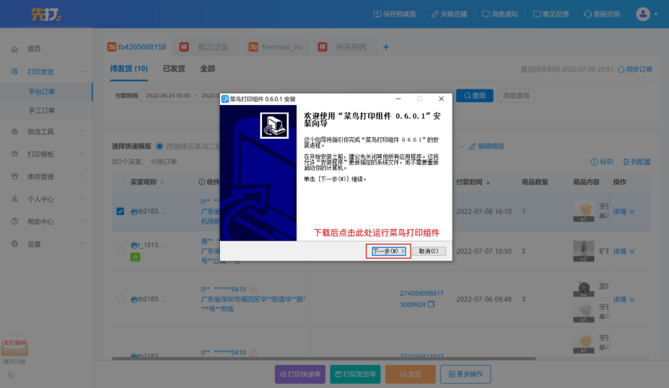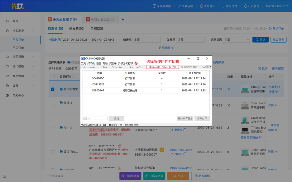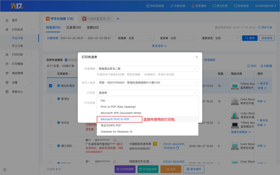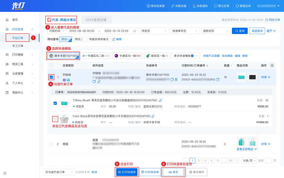 2?? 點(diǎn)擊打印發(fā)貨 ?? 平臺(tái)訂單,進(jìn)入需要代發(fā)的商家店鋪 ?? 選擇快遞模版 ?? 勾選訂單進(jìn)行打印發(fā)貨。