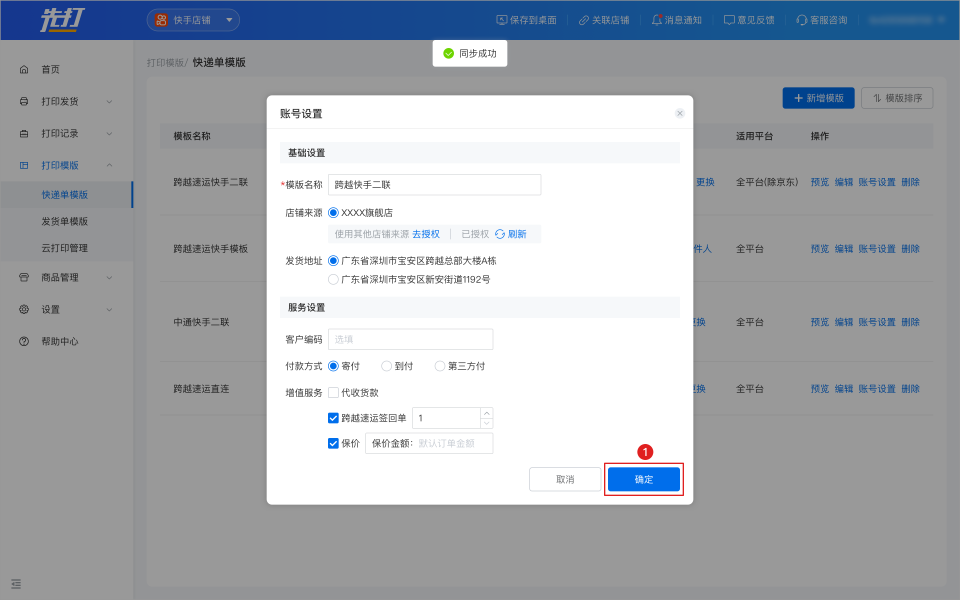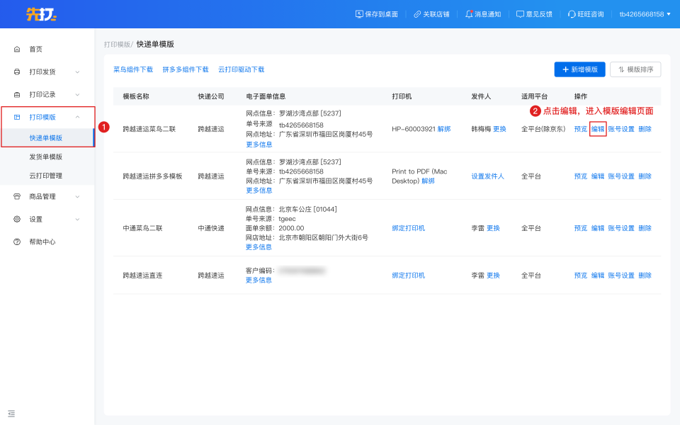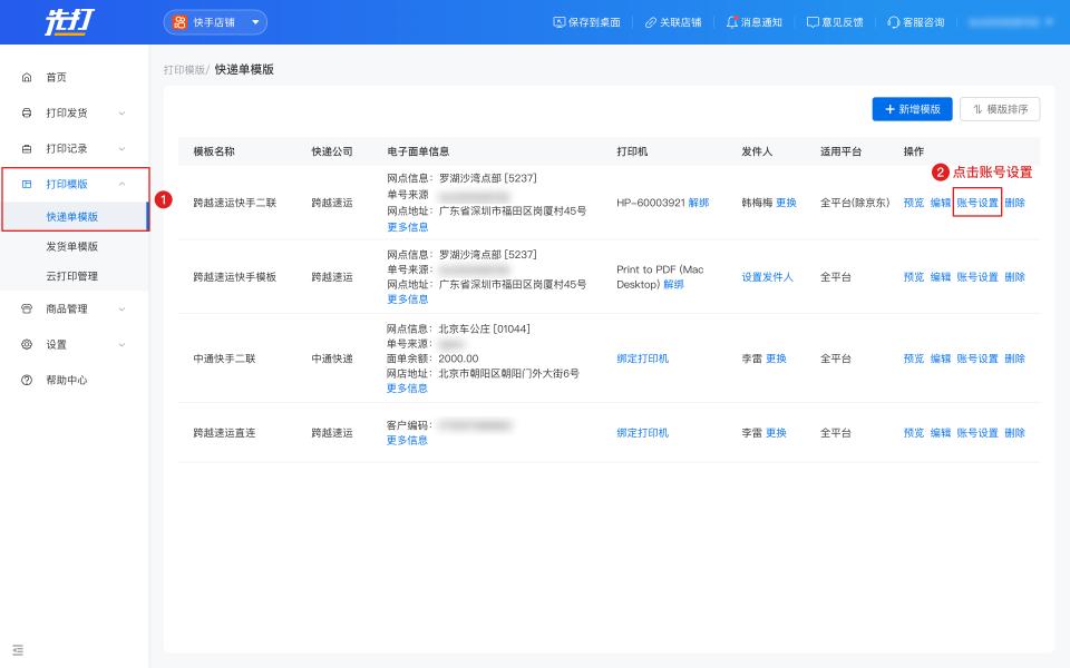 1?? 點(diǎn)擊【打印模版】??【快遞單模版】?? 在模版列表中找到對應(yīng)的快遞單模版,點(diǎn)擊【賬號(hào)設(shè)置】