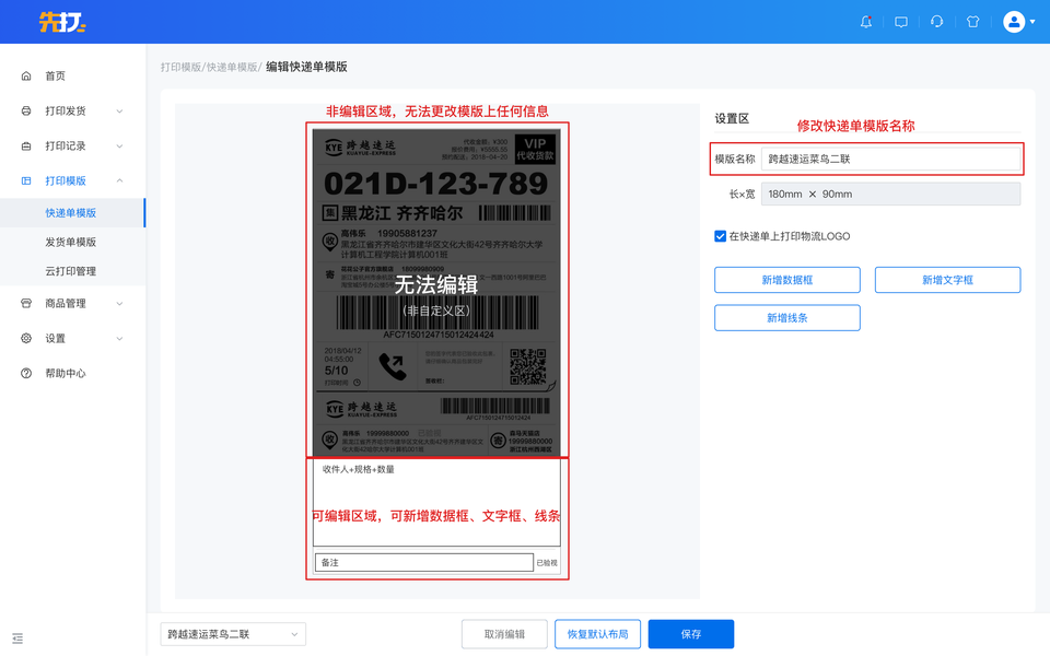 對快遞模板自定義區(qū)可以進(jìn)行添加信息,設(shè)置樣式