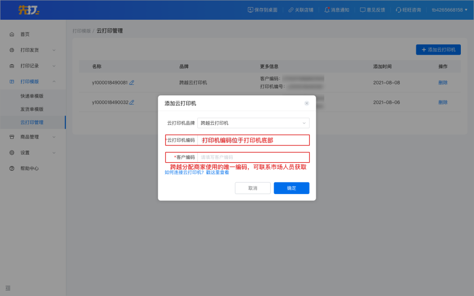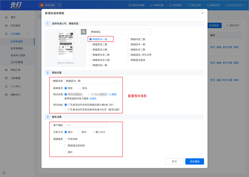 選擇或搜索“跨越”快遞公司,選擇直連類型的面單,填寫直連面單信息線下簽合同的客戶編碼/月結(jié)卡號(hào)、所需的增值服務(wù)、選擇快遞付費(fèi)方式及業(yè)務(wù)類型, 點(diǎn)擊添加模版