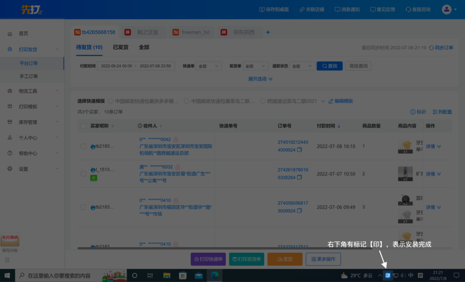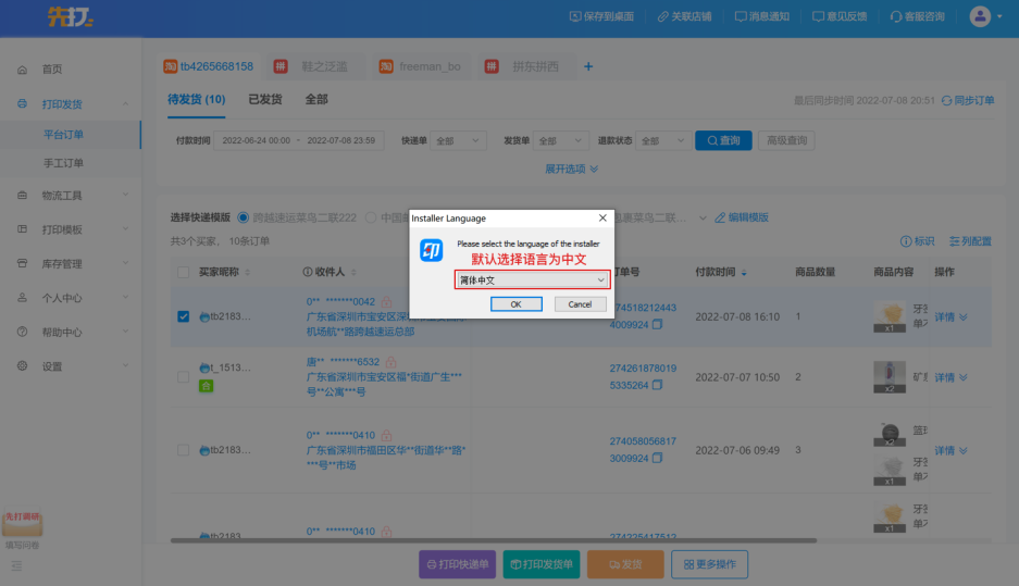 選擇打印發(fā)貨 ?? 平臺(tái)訂單 ?? 勾選需要打印的訂單和快遞單模板,點(diǎn)擊打印快遞單即可