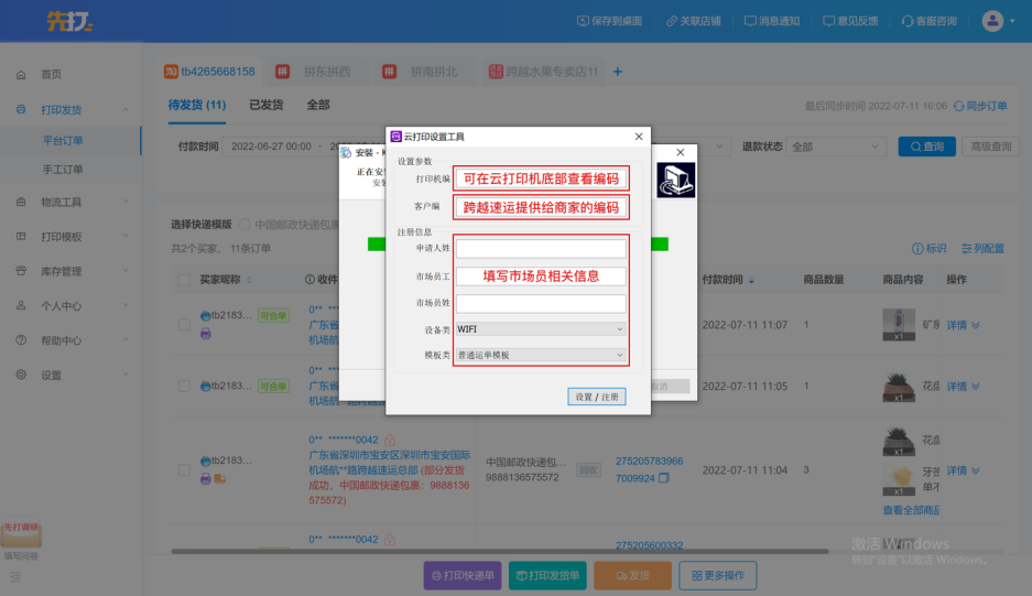 5?? 選中新添加的跨越菜鳥一聯(lián)單 ?? 選擇訂單 ?? 點(diǎn)擊“打印快遞單”