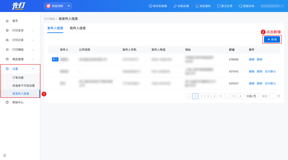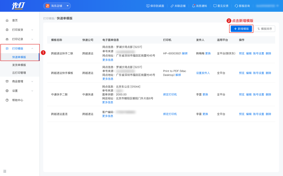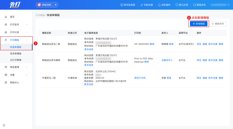 1?? 進(jìn)入先打后,選擇【快遞單模板】?? 點(diǎn)擊【新增模板】