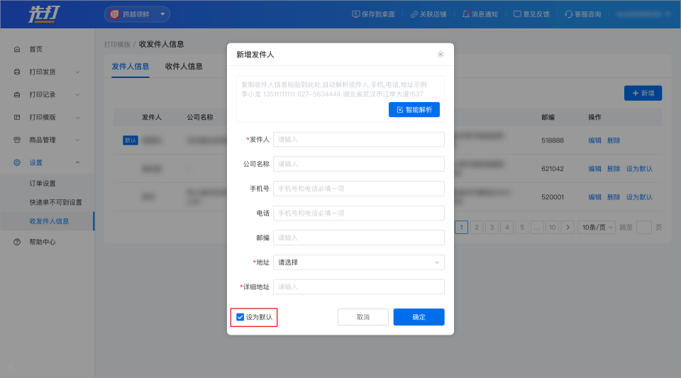 6?? 在打印彈窗中,選擇跨越打印組件,選擇模板尺寸類型和發(fā)件人信息,打印成功后點(diǎn)擊發(fā)貨