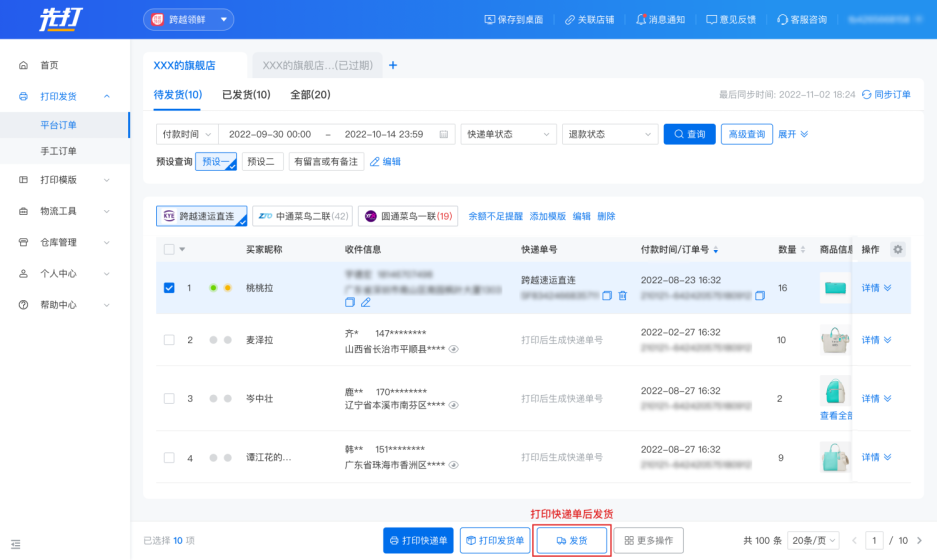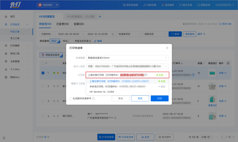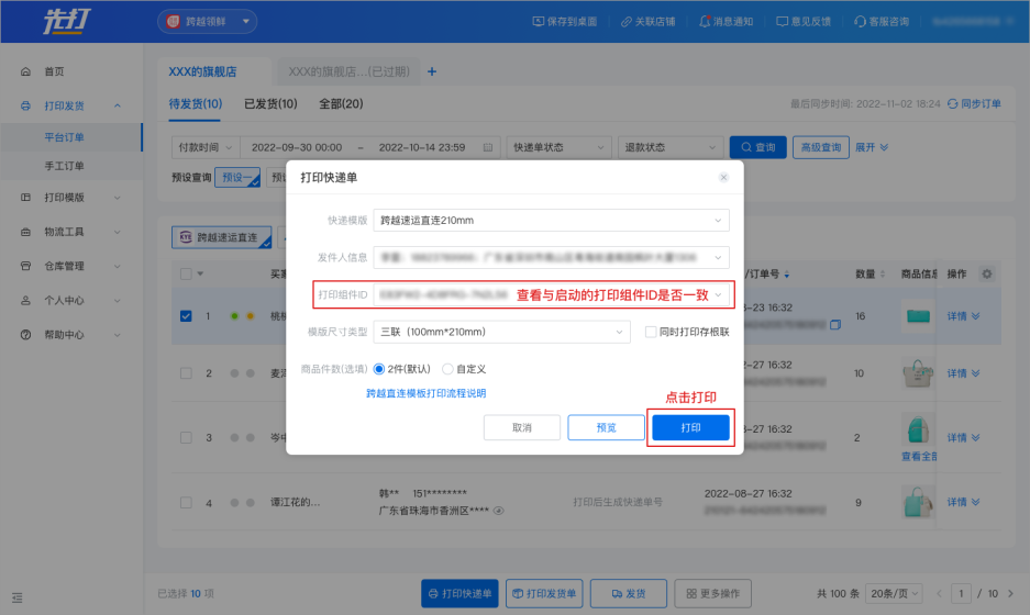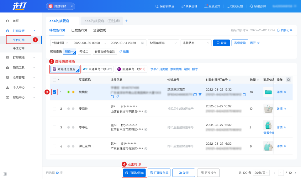 5?? 回到先打打單,點(diǎn)擊【打印發(fā)貨】【平臺(tái)訂單】頁面,選擇訂單并選擇快遞單模板后,點(diǎn)擊【打印快遞單】按鈕