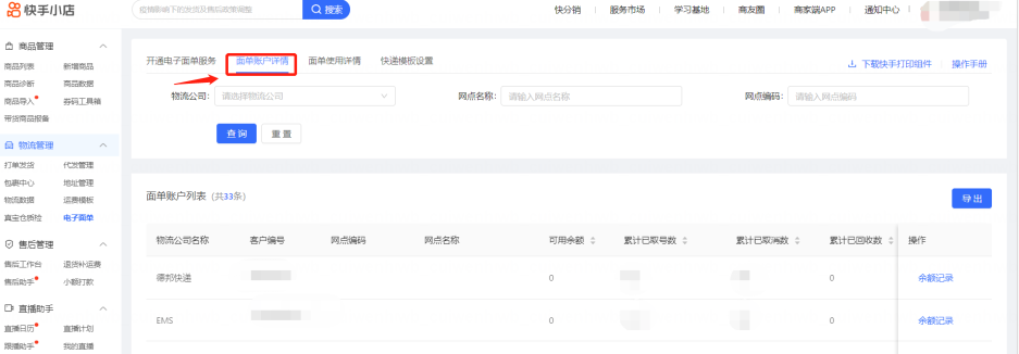 點(diǎn)擊【面單賬戶詳情】可查看合作網(wǎng)點(diǎn)面單使用量及剩余額度
