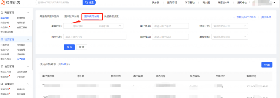 點(diǎn)擊【面單使用詳情】可查看面單具體使用明細(xì)