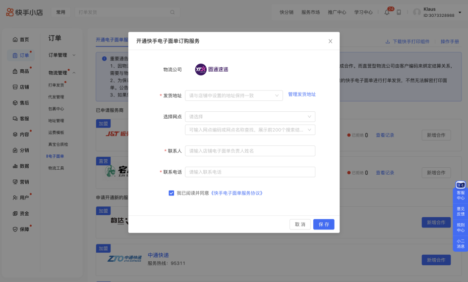 登錄快手小店后臺(tái) ?? 物流管理 ?? 電子面單 ?? 開通電子面單服務(wù)
