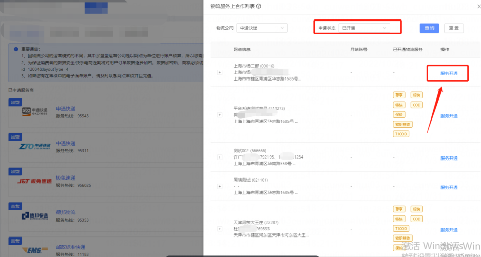 1?? 篩選狀態(tài)為已開通的網(wǎng)點(diǎn),點(diǎn)擊【服務(wù)開通】