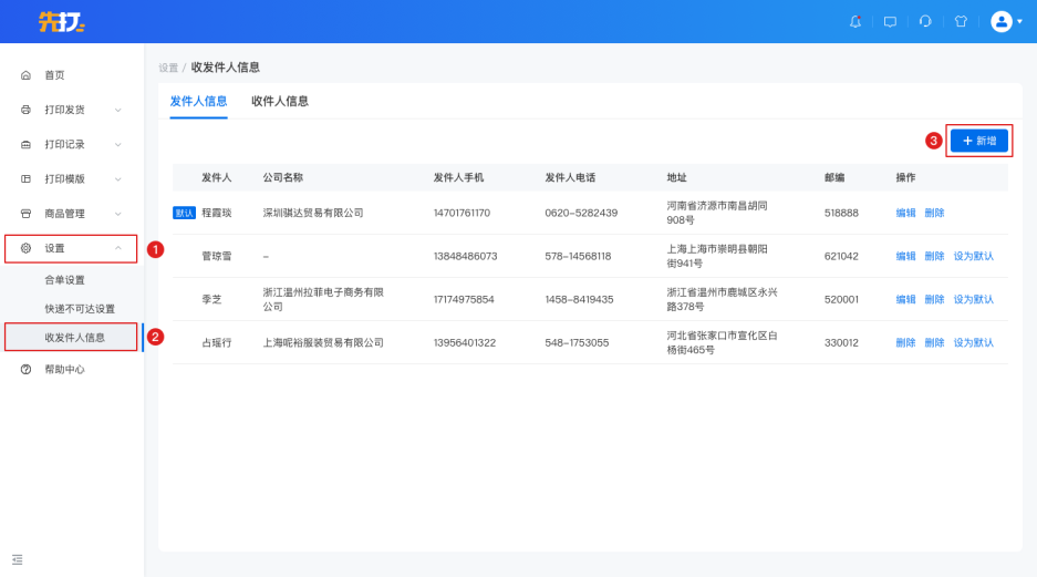 3?? 點(diǎn)擊【設(shè)置】??【收發(fā)件人信息】?? 點(diǎn)擊【新增發(fā)件人】