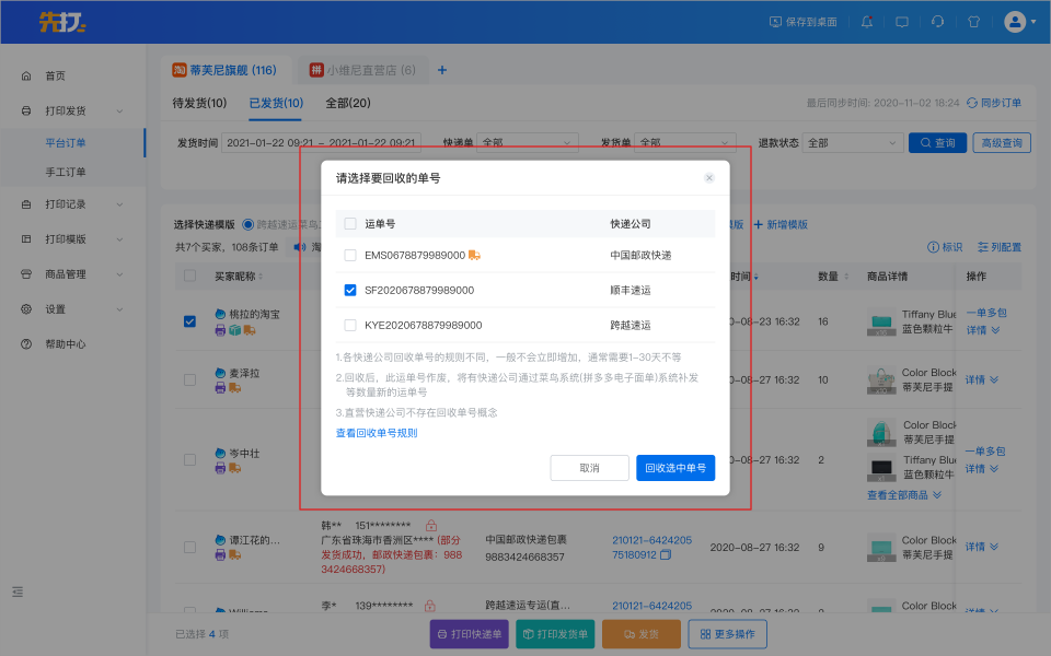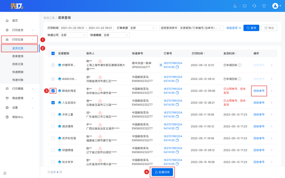 3. 可以使用單號(hào)回收再用功能,避免單號(hào)浪費(fèi),節(jié)約快遞單成本。