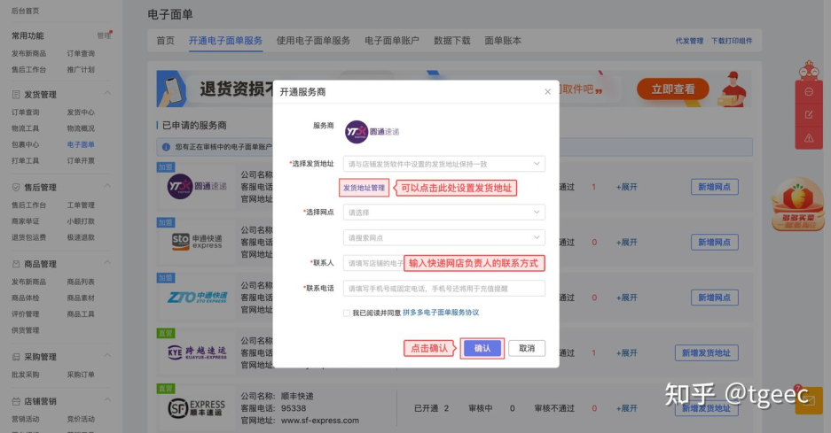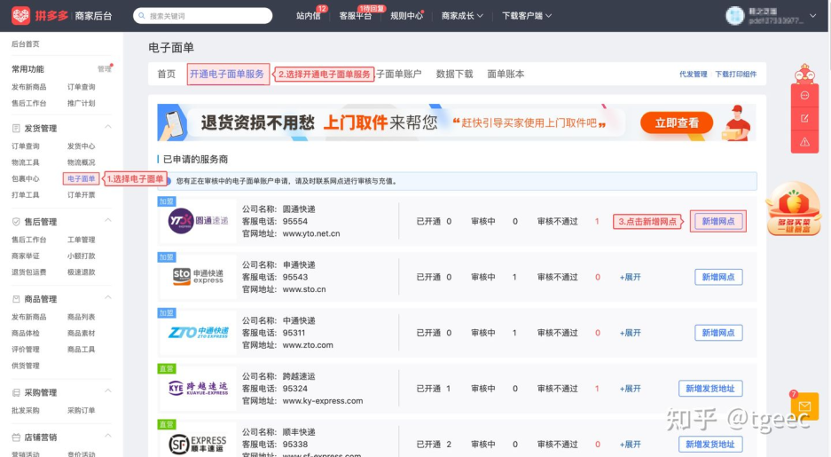 拼多多商家后臺(tái) ?? 電子面單 ?? 開通電子面單服務(wù) ?? 選擇快遞公司 ?? 新增網(wǎng)點(diǎn) ?? 填寫相關(guān)信息